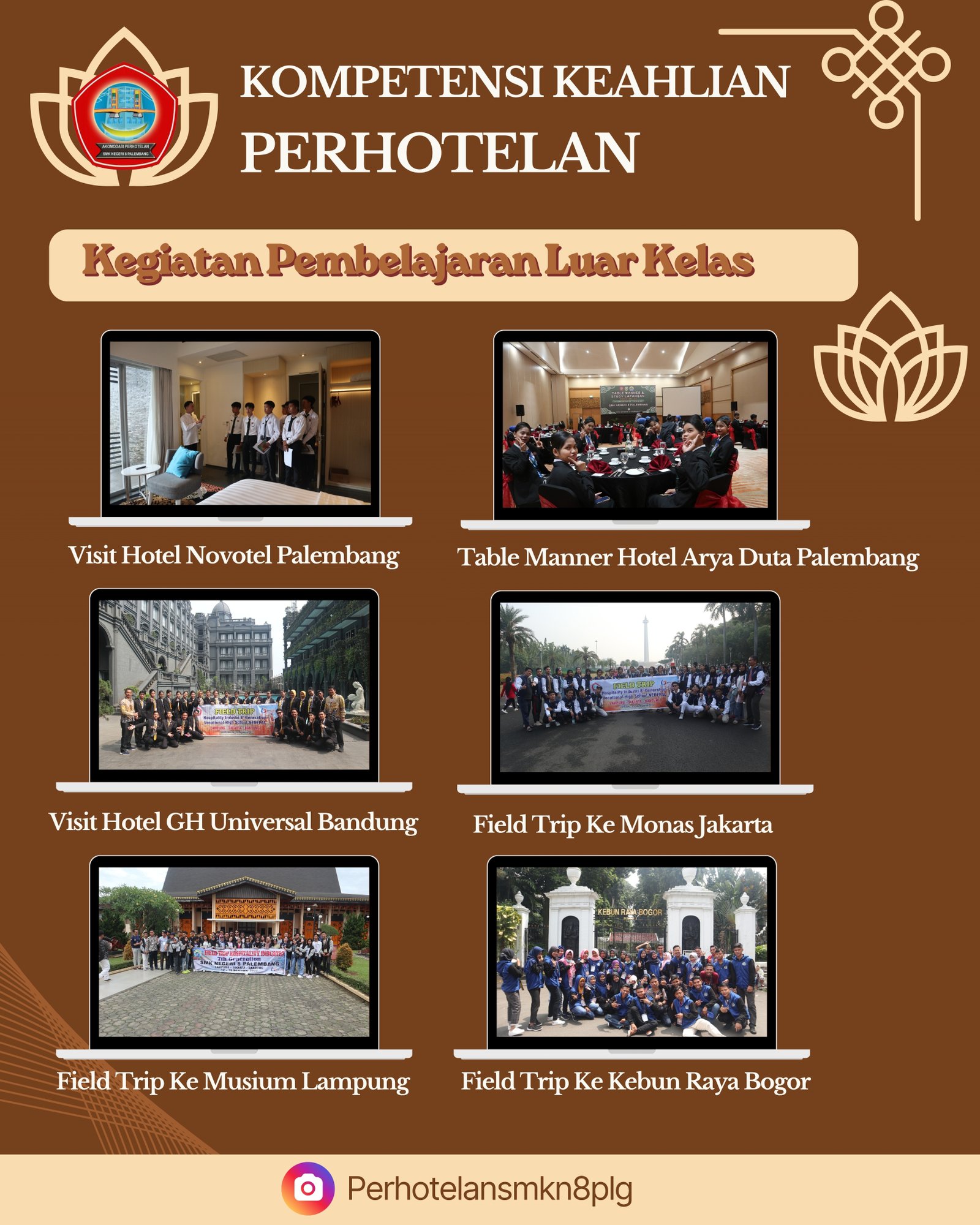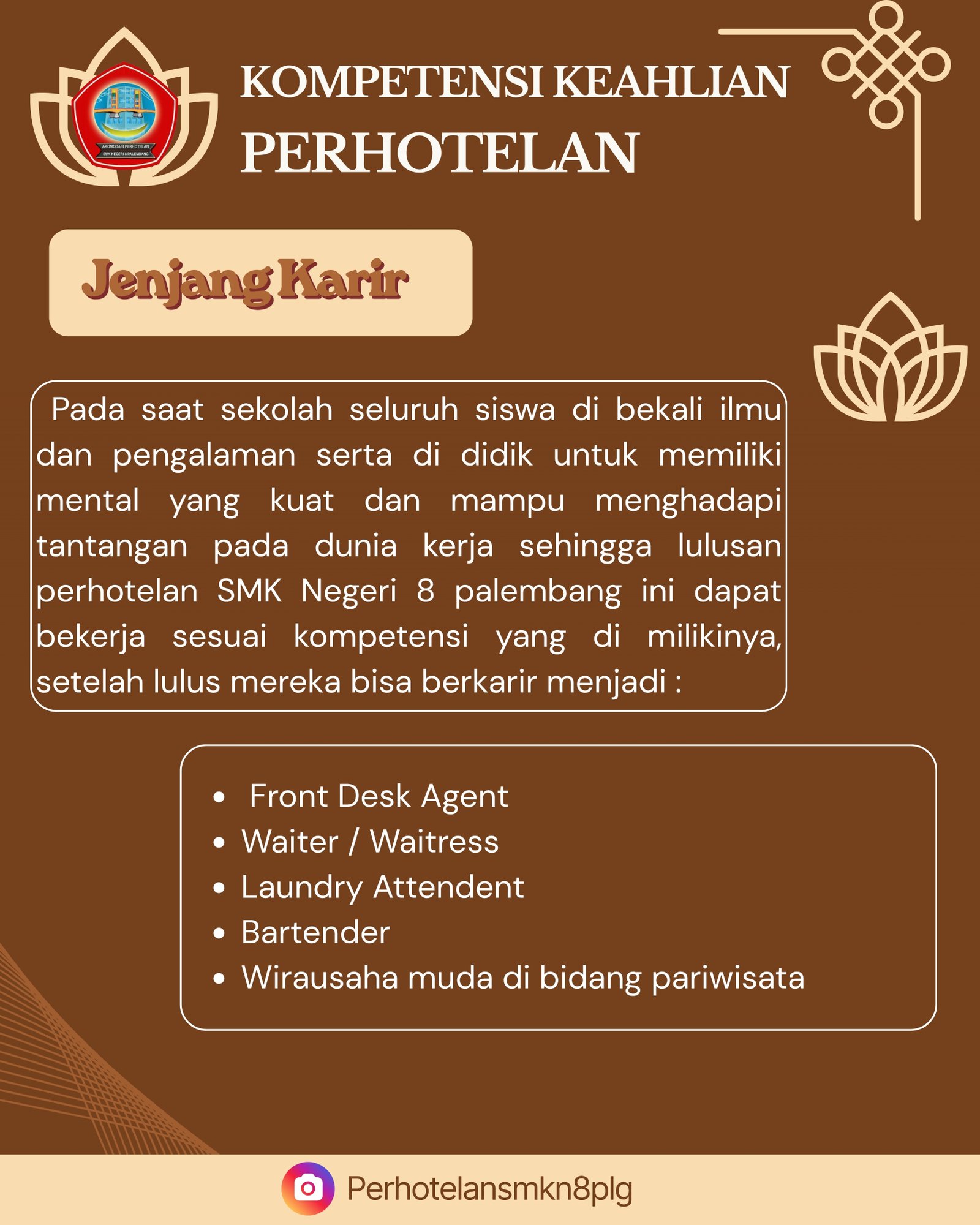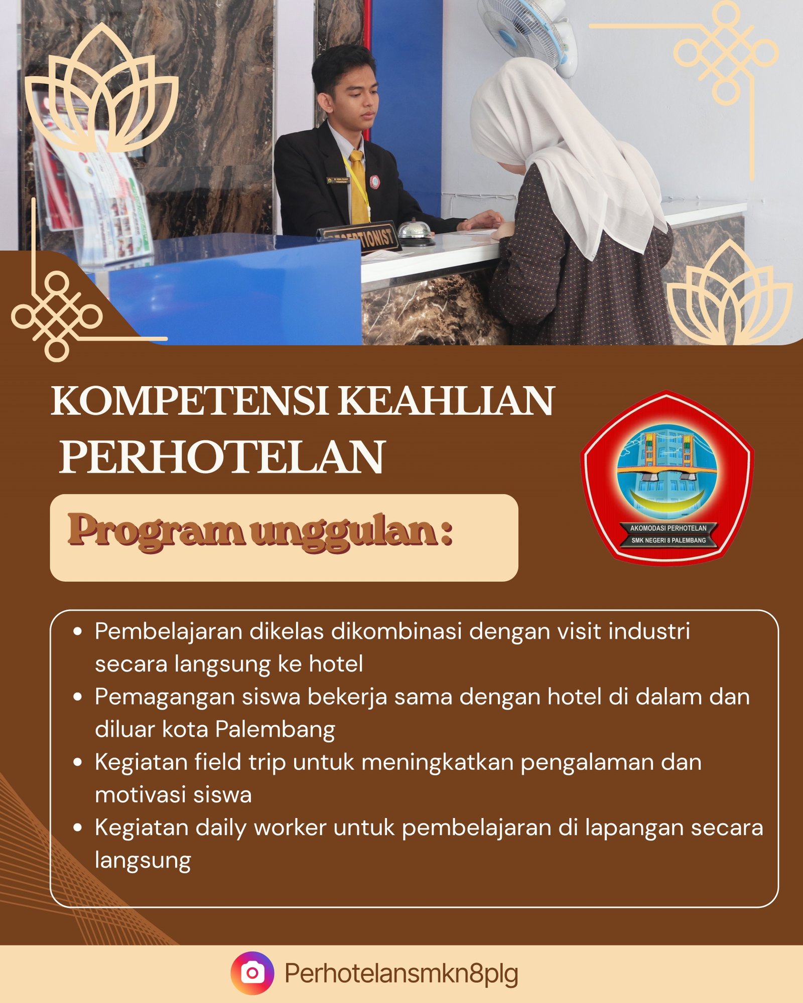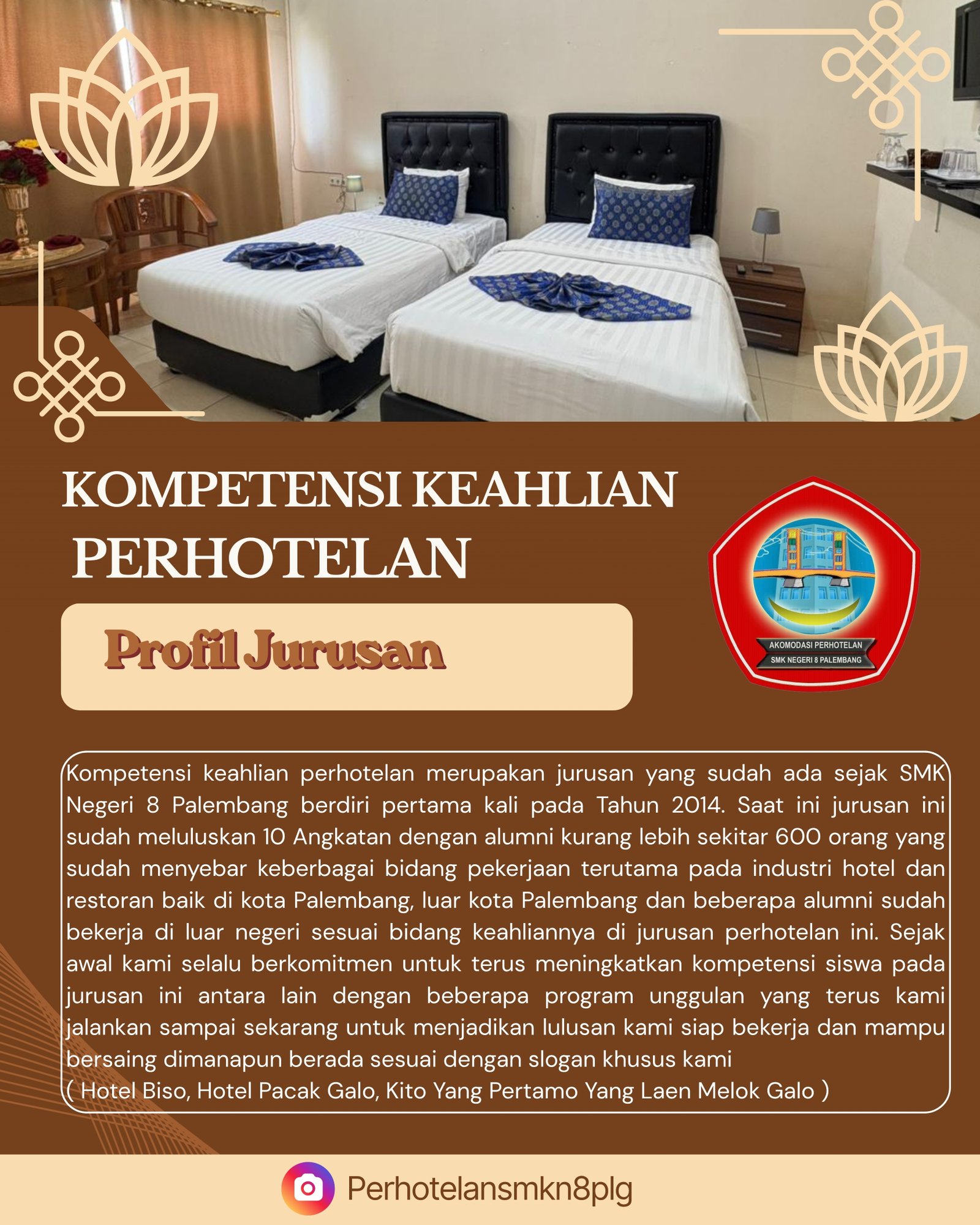 Jurusan Perhotelan merupakan salah satu kompetensi keahlian unggulan di SMK Negeri 8 Palembang yang telah berdiri sejak tahun 2014. Hingga saat ini, jurusan ini telah meluluskan lebih dari 600 alumni yang tersebar di berbagai sektor, khususnya industri hotel, restoran, dan pariwisata—baik di dalam negeri maupun luar negeri.